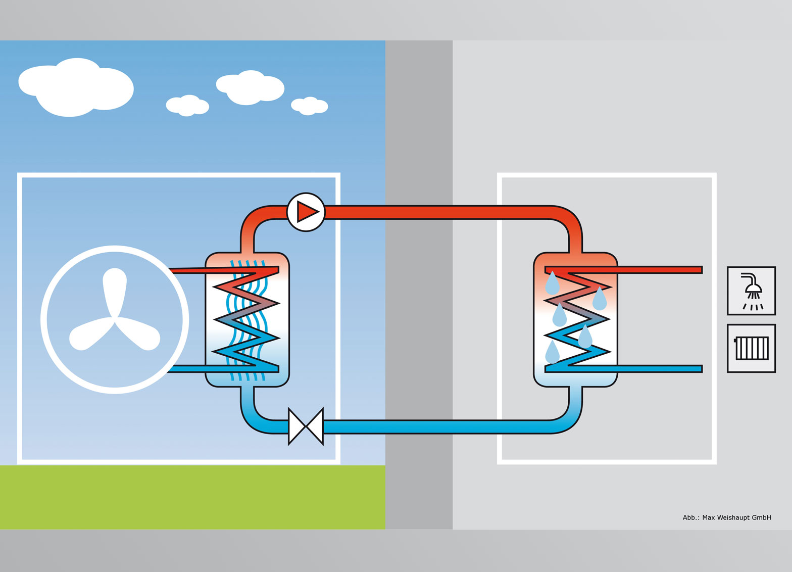 In der Wärmepumpe befindet sich ein weiterer Kreislauf, in dem ein so genanntes Kältemittel zirkuliert. In einem Wärmetauscher, dem Verdampfer, wird die Umweltenergie von dem ersten Kreislauf auf das Kältemittel übertragen, das dadurch verdampft. Bei Luftwärmepumpen erhitzt die Außenluft das Kältemittel. Der Kältemitteldampf wird nun zu einem Verdichter/Kompressor weitergeleitet. Dadurch hebt sich das Temperaturniveau des gasfürmigen Kältemittels, es wird also heißer. In einem weiteren Wärmetauscher, dem so genannten Verflüssiger, wird das unter hohem Druck stehende, heiße Kältemittelgas nun kondensiert, wobei es seine Wärme wieder abgibt.